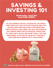 You will be guided on your financial roadmap by Jim Curran, Director of Financial Know-How at Cape Cod 5. Jim will be sharing the tools, tips and resources, both mechanical and behavioral, to navigate your way toward a healthier relationship with your money. The best return you’ll ever get on your money is peace of mind. We look forward to seeing you!