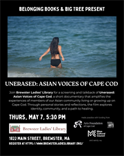 Join Brewster Ladies' Library for a screening and talkback of Unerased: Asian Voices of Cape Cod, a short documentary that amplifies the experiences of members of our Asian community living or growing up on Cape Cod. Through personal stories and reflections, the film explores identity, community, and a path to healing.